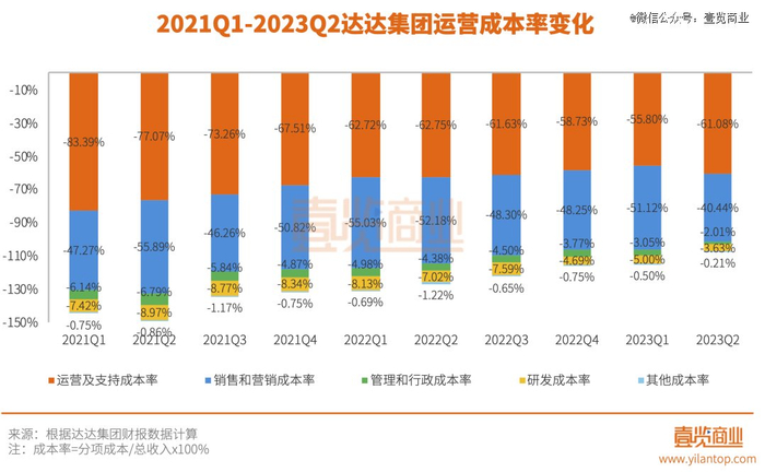 与京东之间在团队和业务上的逐步融合,给达达在成本控制方面带来的收效显著,尤其在营销和研发上,京东可复用的营销资源和技术能力让达达节省了不少费用。今年第二季度,达达的总运营成本率降至新低的107.37%,距离经营性盈利又近一步。