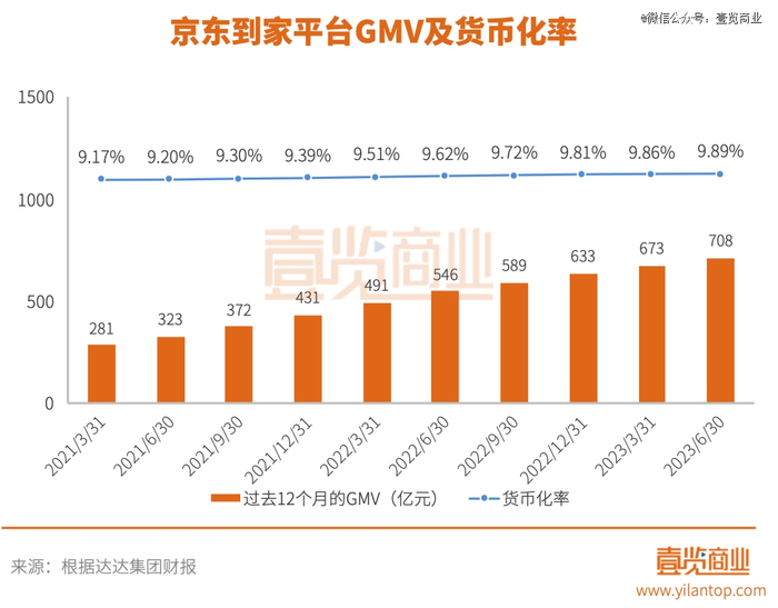 京东到家的营收来自于商家的佣金、在线广告和营销服务以及履约服务。截至6月30日的12个月内,京东到家GMV达708亿元,同比增长29.67%,货币化率保持稳定,缓升至9.89%。