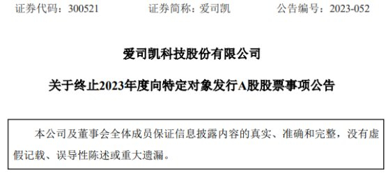 中国经济网北京8月18日讯 爱司凯(300521.SZ)昨晚发布了关于终止2023年度向特定对象发行A股股票事项公告。