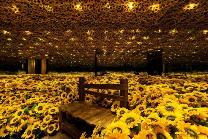 在灯光、色彩、向日葵、镜面的印衬下,让人感到空旷的世界上依然有温情,七夕带上你的Ta来这里观展打卡,在花海里一起感受爱意的蔓延。
