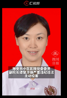 8月17日晚,四川雅安市纪委监委发布消息称,雅安市中医医院党委委员、副院长谭慧涉嫌严重违纪违法,主动投案,经雅安市纪委监委指定管辖,雅安市雨城区纪委监委正对其进行纪律审查和监察调查。