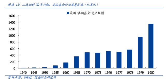 诸如富达、富兰克林邓普顿基金、联博、伯克希尔·哈撒韦等一大批后来享誉全世界的基金公司都是诞生于这个时期。从数据来看,在1945年至1970年间,美国共同基金的总规模从12.8亿美元,增长至476.2亿美元。