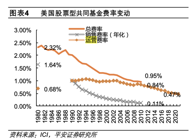 其中,销售费用基于购买和赎回行为,一次性支付给代销机构;运营费用则计入基金资产,包括管理费、12b-1费用以及托管、清算等其他费用,管理费是构成运营费用的最主要部分。