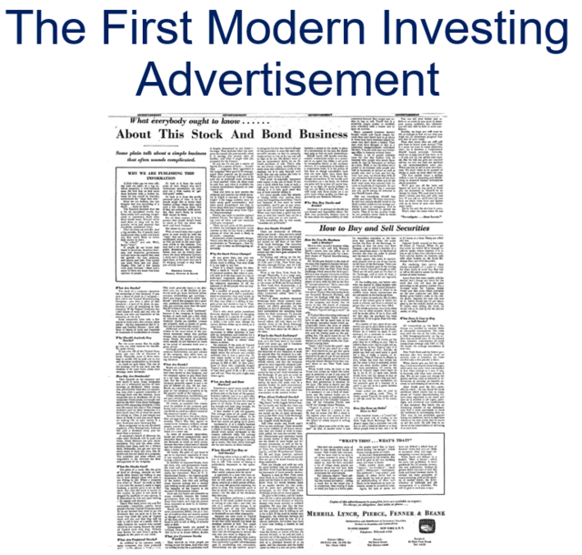1948年,美林证券制作了一份广告,开始进行大范围的‘投资者教育’。广告内容也很简单,就是告诉那些手上有钱的普通人如何购买股票,这份广告收到了300万份回复。