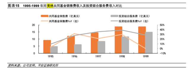 数据显示,1995-1999年间,美林投资组合服务费收入(包括个人组合管理服务、美林咨询收入、以及其他投资组合服务费等)CAGR达32.70%,高于共同基金销售费收入的增长率。