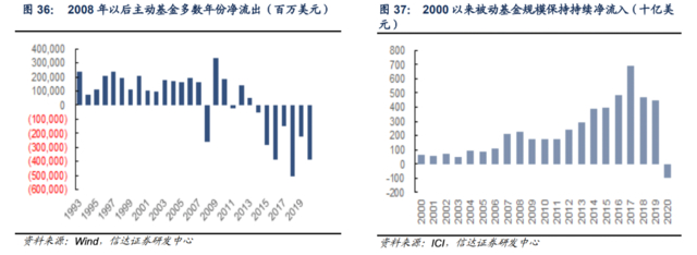 首先,随着美国资本市场的成熟,市场有效性持续增强,主动基金管理人中的大多数在90年代后期就开始跑不赢指数了。