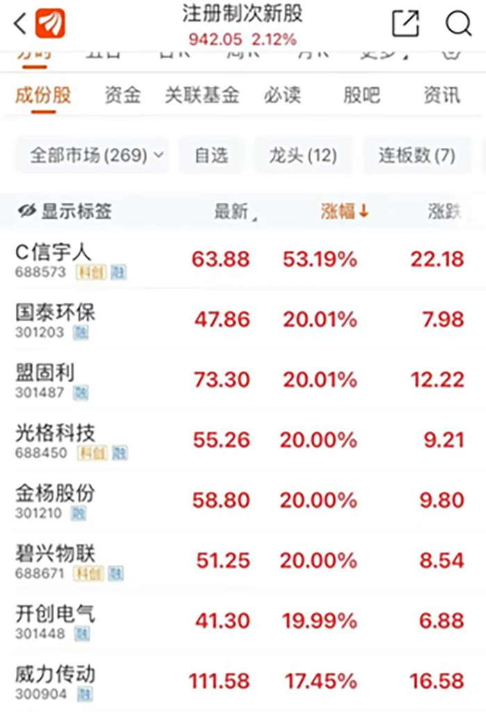 注册制次新股亦大幅拉升,C信宇人涨超50%,国泰环保、盟固利、光格科技等多股20%涨停。其中,盟固利已连续3日涨停,该股在上市首日遭到“爆炒”,盘中一度暴涨37倍。