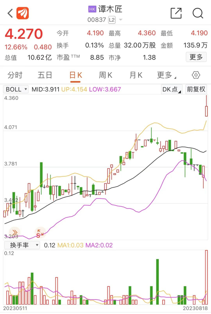 “木梳大王”谭木匠今日盘中股价创下历史新高,达4.36港元/股,目前涨12.66%,报4.27港元/股。