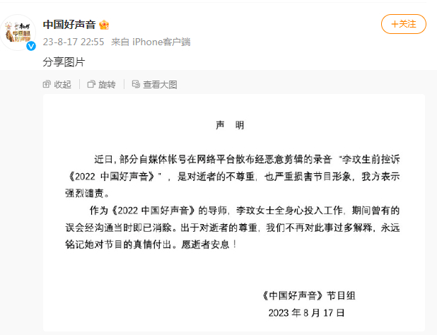对此,《中国好声音》节目官方微博在8月17日晚发布声明。