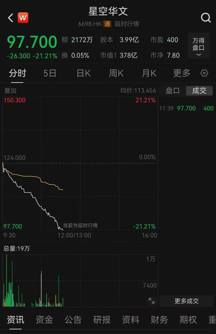 8月18日早盘,星空华文一度跌超20%。