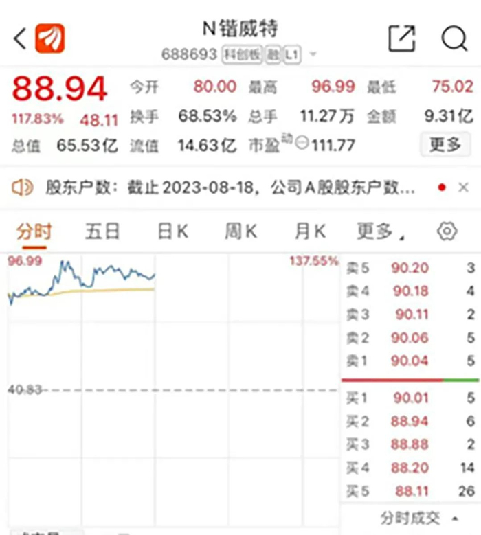 今日上市的科创板新股锴威特也大涨超110%,盘中最高价格达到96.99元/股。