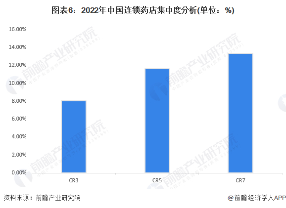 2022年,中国连锁药店行业集中度CR3仅为8.03%,CR5不到12%,CR7不到14%,行业集中度处于较低水平,未来仍有较大的提升空间。