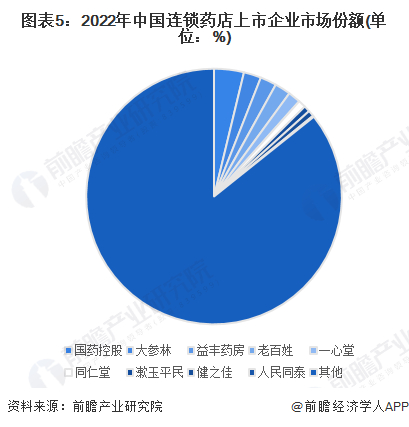 2022年,中国连锁药店上市公司中,国药控股市场份额约为3.77%,大参林、益丰药房和老百姓市场份额在2%-3%之间。