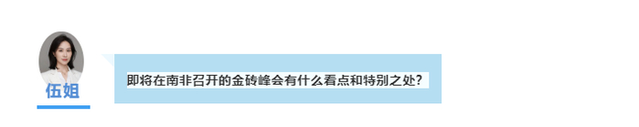 伍姐邀请中国国际问题研究院发展中国家研究所所长王友明、中国现代国际关系研究院金砖暨G20中心主任徐飞彪、社科院“一带一路”研究中心副秘书长许文鸿,解读本届金砖峰会。