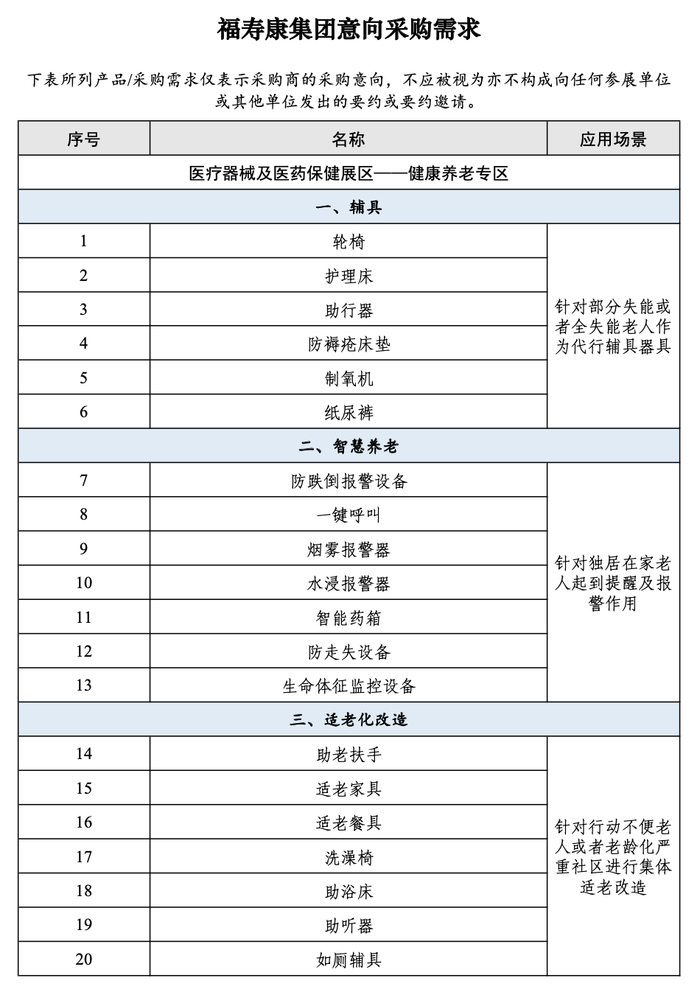 本次发布的采购商意向需求来自于进博会重要采购商福寿康集团,涉及3个品类、20种产品,包括护理床、生命体征监控设备、适老家居等,全部集中于医疗器械及医药保健展区健康养老专区。福寿康集团2011年成立于上海,致力于提供优质便捷的社区居家医疗、护理、康复和养老服务。集团业务布局全国50余个城市,运营400余个服务站点,包括医疗护理站、社区日托、长照中心、养老院、中医诊所、护理培训学校等,服务全国用户10余万人,年服务量超过1500万人次。