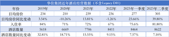 华住集团财报显示,2023年前两季度其入住率、日均房价、酒店数量三个维度持续上升。第二季度,其RevPAR为250元,是2019年同期的121%。