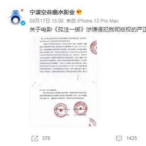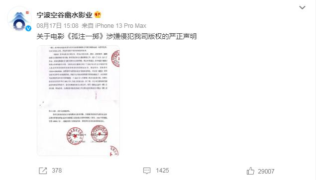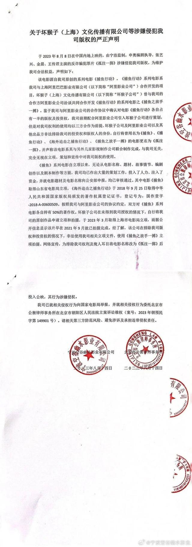 8月17日,宁波空谷幽水影业在微博发布声明称,电影《孤注一掷》涉嫌侵犯自己公司原创系列电影《捕鱼行动》的版权,已向国家电影局举报并提起诉讼。