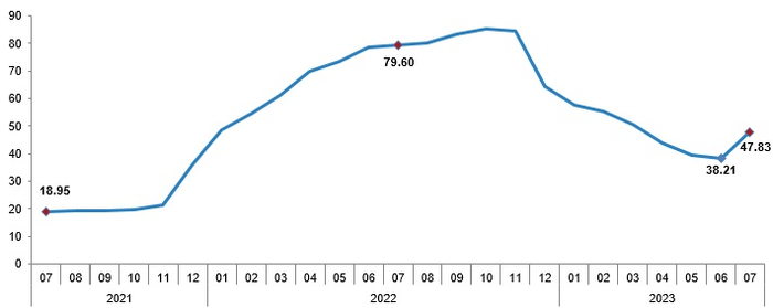 8月初,土耳其统计署公布的7月份通胀率升至47.83%,高于6月份的38.21%,结束了连续8个月的回落。分析人士表示,里拉持续贬值和土耳其近期采取的税收调整政策是通胀率回升的主要原因。