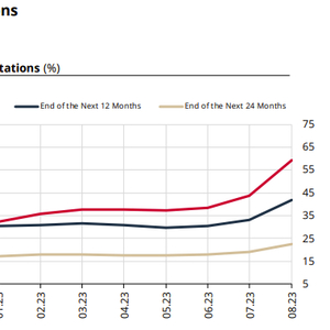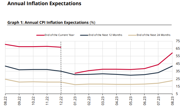 分析指出,这一系列的结果在一定程度上受到了土耳其央行官方预测的影响。7月底时,该行将土耳其2023年底通胀预期从22.3%上调至58%,并预计要直到明年的二季度,通胀才会达到60%的峰值。