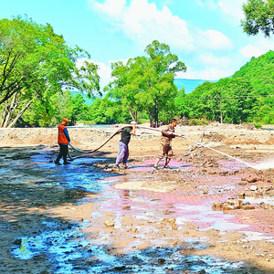 往日游客熙熙攘攘的威虎山漂流站终点,洪水肆虐后一片狼藉。三名工人正互相配合清洗地面,一旁的铲土车往来穿梭铲除垃圾。