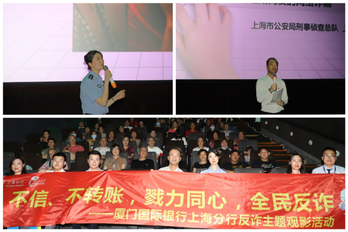为提高市民的反诈意识,共同构筑反诈“防火墙”,厦门国际银行上海分行于8月18日联合上海市虹口区广中路街道开启反诈主题公益观影活动,对前来观影的市民群众进行反诈宣传。此次观影活动特邀上海市反电信网络诈骗中心民警现场短课分享,让参与市民更加清楚什么是电信网络诈骗、如何预防电信网络诈骗、被骗后如何报警,多层次多角度帮助观影市民远离电信诈骗。现场气氛热烈,观影市民纷纷表示,此次观影活动让自己对反诈有了更深的认识,并且会将民警与银行的提醒牢记于心。