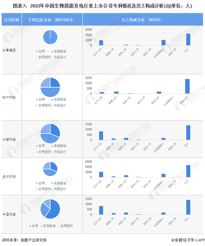 从生物质能发电行业相关上市企业员工总数来看,最多的是瀚蓝环境,达到25782人;技术人员最多的同样是瀚蓝环境,达到1850人;从专利数量看,中国天楹最多,达到223项。