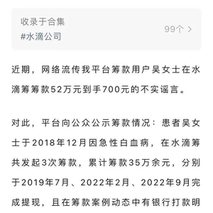 警方通告指出,患者吴女士于2018年12月患疾病,其在水滴筹平台先后发起3次筹款累计35万余元,目前均已完成提现,不存在“筹款52万仅到手700元”的情况。