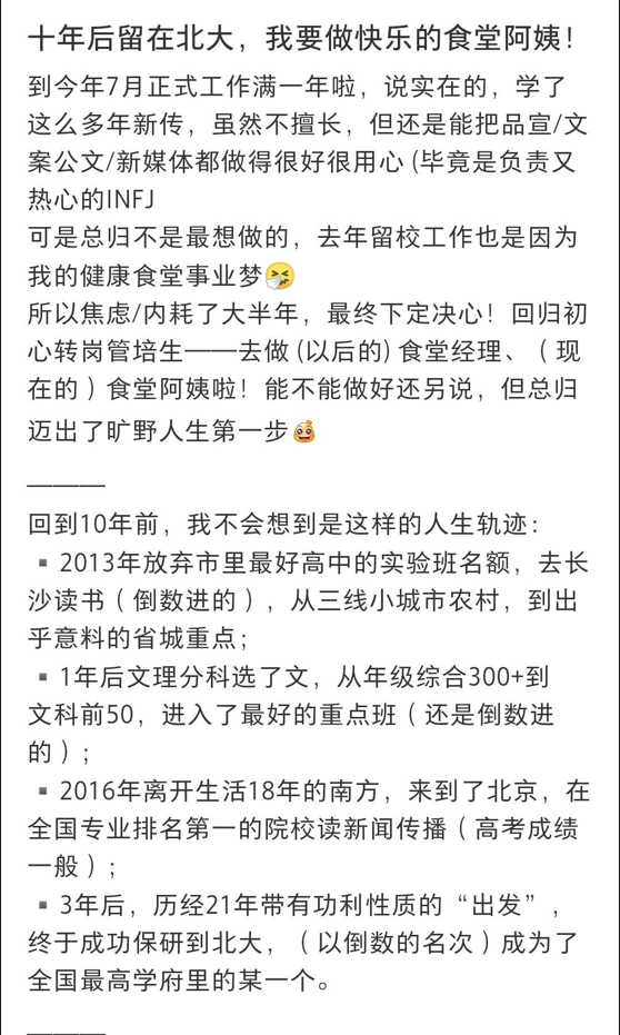 8月13日,黄小姐发文称,十年前自己去长沙读书,后一路考到北京的学校读新闻传播专业,后来又成功保研北大。十年后,她找到了人生的新方向、新事业,“先从食堂阿姨一步步做起!”
