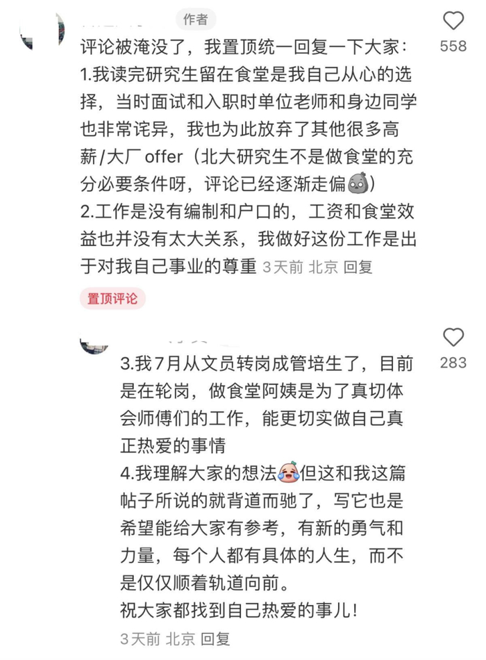 黄小姐在评论区回复表示,北大研究生毕业留在食堂工作,是自己遵从内心的选择,她为此也放弃了很多高薪工作,当时单位老师和身边同学也非常诧异。