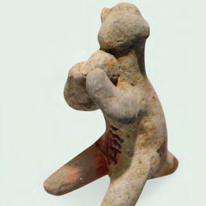 70年代湖北天门邓家湾遗址出土一批红陶动物,其中有一件陶猴,长6.5、宽2.4厘米。陶猴的两前肢捧一物举在胸前,两后肢分开、以类似箕踞的姿态坐在地上,呈现出早期艺术不拘于礼法的一派天然特色(图1)。