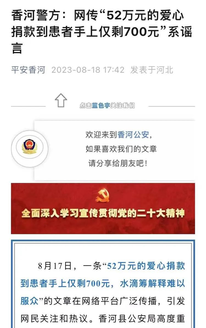 近日,“52万元的爱心捐款到患者手上仅剩700元,水滴筹解释难以服众”的信息在网络平台广泛传播。8月18日,河北香河警方发布通告称,该信息为谣言,并对谣言发布者李某依法予以行政处罚。与此同时,包括“熊猫观天下”“薛圣东梅鹤楼主”“伊人格慕”“一种可怜生落日和烟雨”在内的众多“自媒体”删除相关造谣内容,并就不实信息发布致歉声明。