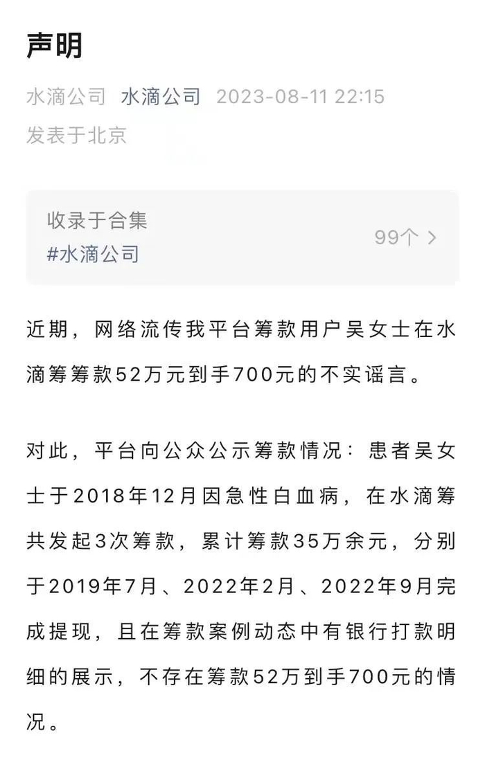 警方通告指出,患者吴女士于2018年12月患疾病,其在水滴筹平台先后发起3次筹款累计35万余元,目前均已完成提现,不存在“筹款52万仅到手700元”的情况。