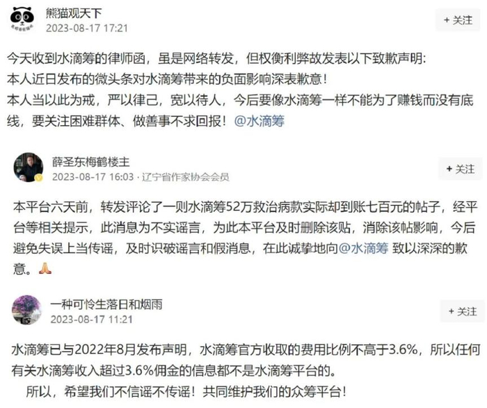 与此同时,“熊猫观天下”“薛圣东梅鹤楼主”“伊人格慕”“一种可怜生落日和烟雨”等“自媒体”账号已经删除不实内容,并公开致歉,承认是依据网络流传信息且未经核实就擅自发布造谣内容。水滴公司通过多种方式进行举报投诉,对于拒不删除不实内容的恶意造谣者,将保留采用法律手段追究责任的权利。