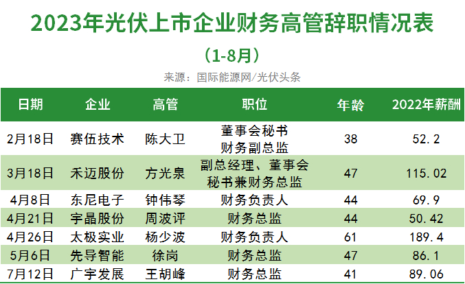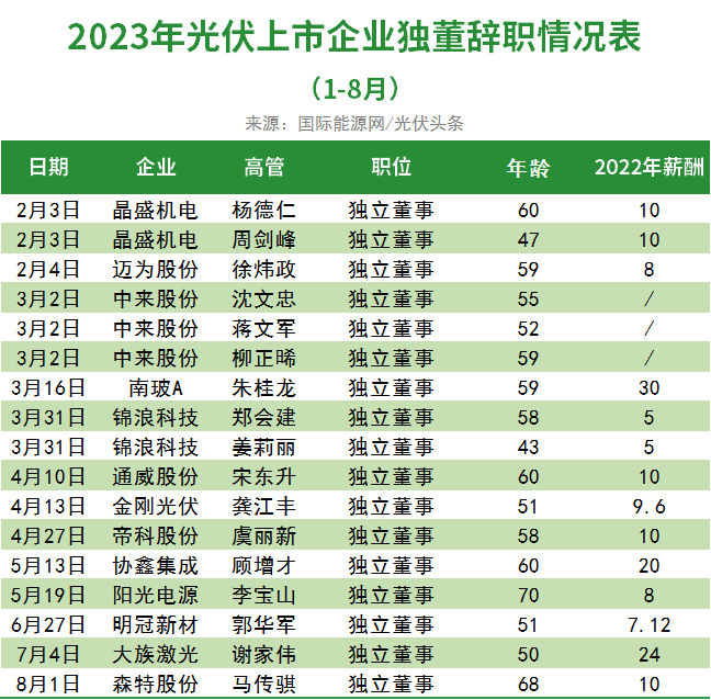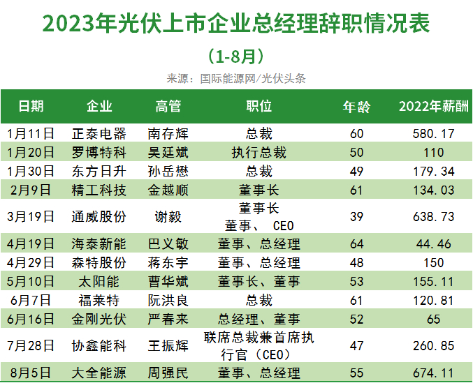 2023年1月,东方日升总裁孙岳懋辞职,正泰电器南存辉辞去总裁职位;2月,天合光能核心技术人员方斌辞职,精功科技董事长金越顺辞职;3月,通威股份董事长、CEO谢毅因个人原因请辞……8月大全能源副董事长张龙根、总经理周强民双双请辞!