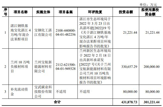 宝武碳业拟募集资金301,221.44万元,用于湛江钢铁基地宝化湛江4万吨/年混合法苯酐项目、兰州10万吨负极材料项目、补充流动资金。