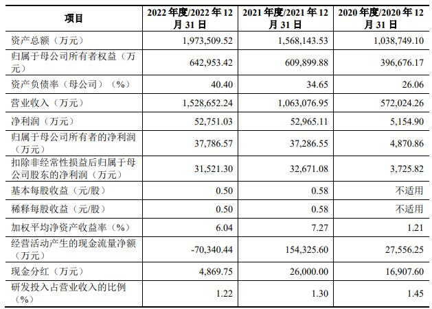 2022年营收152.87亿净利5.28亿