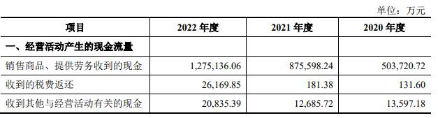 2020年、2021年、2022年,宝武碳业销售商品、提供劳务收到的现金分别为503,720.72万元、875,598.24万元、1,275,136.06万元;经营活动产生的现金流量净额分别为27,556.25万元、154,325.60万元、-70,340.44万元。