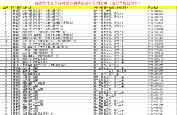 8月18日,市卫生健康局相关负责人接受采访时介绍,目前惠州有31间社区卫生服务中心和66间乡镇卫生院,均开设了预防接种门诊为儿童提供预防接种服务。其中市区、县城和人口密集的镇(街道)接种门诊均有推行周末接种和分时段预约接种服务。有62家开展周末接种服务。