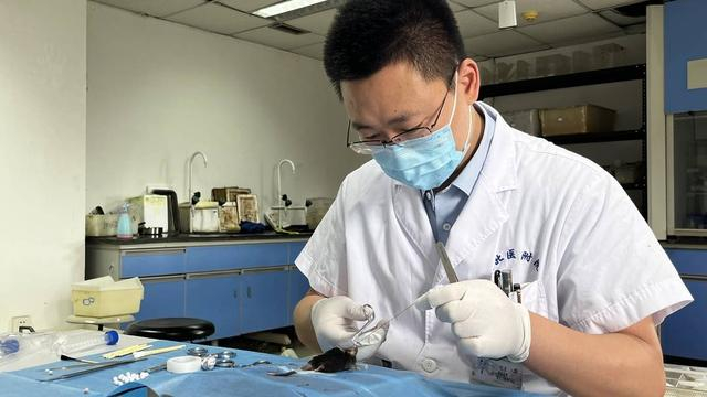 赵龙正在练习缝合。
