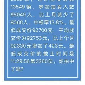 8月19日,上海公布当月沪牌拍卖结果。最新数据显示,8月份上海沪牌个人额度投放10890辆,个人在用车有效额度委托拍卖2659辆,合计拍卖总数13549辆,参加拍卖人数98049人,比上月减少了8066人,中标率13.8%。最低成交价92700元,平均成交价为92753元,比上个月92330元增加了423元。