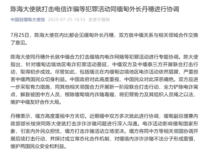 陈海大使同丹穗外长就中缅合力打击缅境内电诈网赌等犯罪活动进行专题协调。陈大使指出,针对缅甸边境地区电诈犯罪活动蔓延,中缅双方及中缅泰三方开展联合打击行动,取得初步成效。尽管如此,包括缅北在内缅甸边境地区电诈活动依然猖獗,严重损害中缅两国民众切身利益。中国政府对此高度重视,中国民众对此深恶痛绝。双方应进一步采取有力措施,同其他相关邻国合力开展新一阶段联合打击行动,全力铲除电诈窝点,解救被困中方人员,根除缅甸境内诈赌毒瘤,将犯罪势力及其组织人员绳之以法,维护中缅友好合作大局。