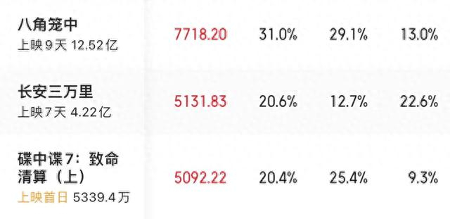 一个很扎心的比较是,作为一部集齐了所有“大爆”元素,并且上映时没有其他新对手的影片,《碟中谍7》上映首日仅收获了5400万元内地票房,还没有已经上映了近10天的《八角笼中》高。