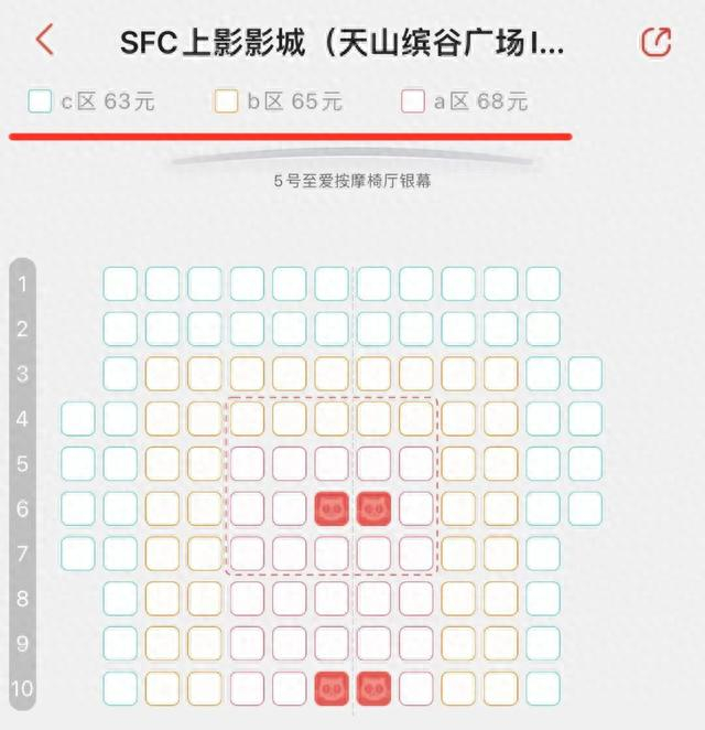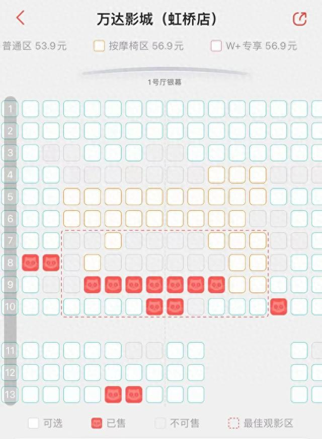 在购票选座时,下图中用虚线框起来的中间排座位是官方推荐的“最佳观影区”,正对大屏幕,距离适中、视野清晰。