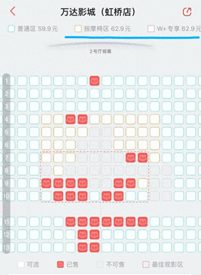 记者搜索发现,大部分影院没有提前锁座,目前只有万达影城在电影选座时存在部分座位不可选的情况。售票页面显示,在映的热门电影不少场次的最佳观影区灰了一片,平台提示这些座位是“W+会员专享”。