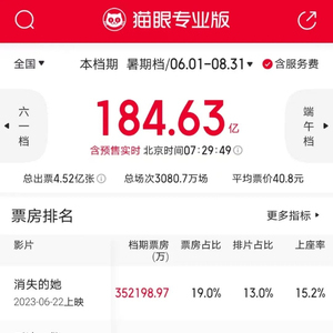 此外,截至8月20日7时30分,2023年暑期档总票房(含预售)已达184.63亿元,创历史新高。此前,2019年暑期档的总票房为177.78亿元。