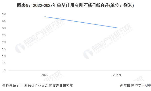 根据中国光伏行业协会数据,2022年多晶硅用金刚线母线直径为57微米,单晶硅用金刚线母线直径为38微米,已经处于较细的状态。未来,金刚线母线直径仍有下降的空间,但是下降幅度将趋缓,中国光伏行业协会预测,到2027年左右单晶硅用金刚线母线直径将下降到30微米左右。