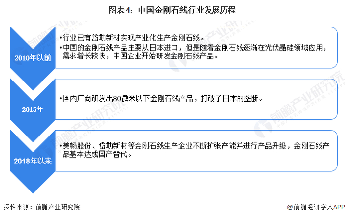 2010年以前,虽然有岱勒新材实现产业化生产,但是金刚石线仍依赖日本进口。随着金刚石线在光伏晶硅切割方面的逐渐应用以及中国光伏产业的发展,金刚石线的需求增长,国内企业开始自主研发金刚石线产品。2015年,国内多家企业已经能够生产80微米以下产品,打破了日本的技术垄断。中国光伏产业的大幅发展也推动金刚石线生产企业研发和创新,2018年以来,几大金刚石线生产企业产能拓张,技术升级,国产金刚石线产品逐渐替代进口产品。