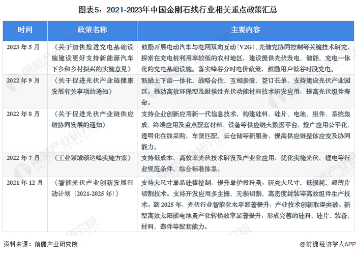 光伏行业目前是金刚石线最主要的应用领域,金刚石线切割技术提升了晶硅利用率,降低了企业的成本。2021年,《智能光伏产业创新发展行动计划(2021-2025年)》提出支持超薄片切割技术发展,完善光伏行业配套产业。近年来,国家颁布多项政策支持光伏行业的发展,推动金刚石线的需求进一步增长。2021-2023年中国金刚石线行业相关重点政策汇总解读如下: