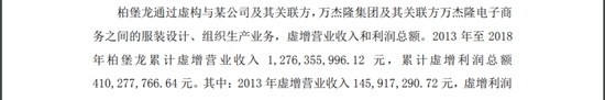 柏堡龙首次公开发行股票招股说明书、2016年非公开发行股票发行情况报告书暨上市公告书及定期报告存在虚假记载。柏堡龙财务造假的手段为通过虚构与某公司及其关联方,万杰隆集团及其关联方万杰隆电子商务(以下简称万杰隆)之间的服装设计、组织生产业务,虚增营业收入和利润总额。2013年至2018年柏堡龙累计虚增营业收入12.76亿元,累计虚增利润总额4.10亿元,导致柏堡龙首次公开发行股票招股说明书(报告期2012年至2014年)、2016年非公开发行股票发行情况报告书暨上市公告书(报告期2013年至2016年1-9月)、2015年至2018年年报存在虚假记载。