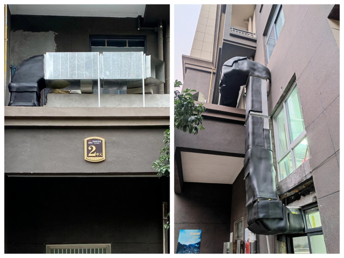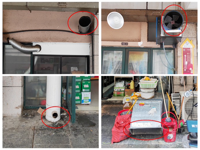 督察发现,该市南谯区港汇中心城商业内街未设置公共烟道,却建有多家饭店,烟道开口设置“乱象丛生”,有的油烟在门店上方直排、有的位于地面低空排放,多数将排口烟气排向城镇排水管道。东坡西路发能国际城小区41幢楼下的定远土菜馆、娟玲私房菜等饭店将油烟净化设备置于门店外,油烟四处逸散。其中,定远土菜馆等饭店还使用人造草坪遮挡油烟。